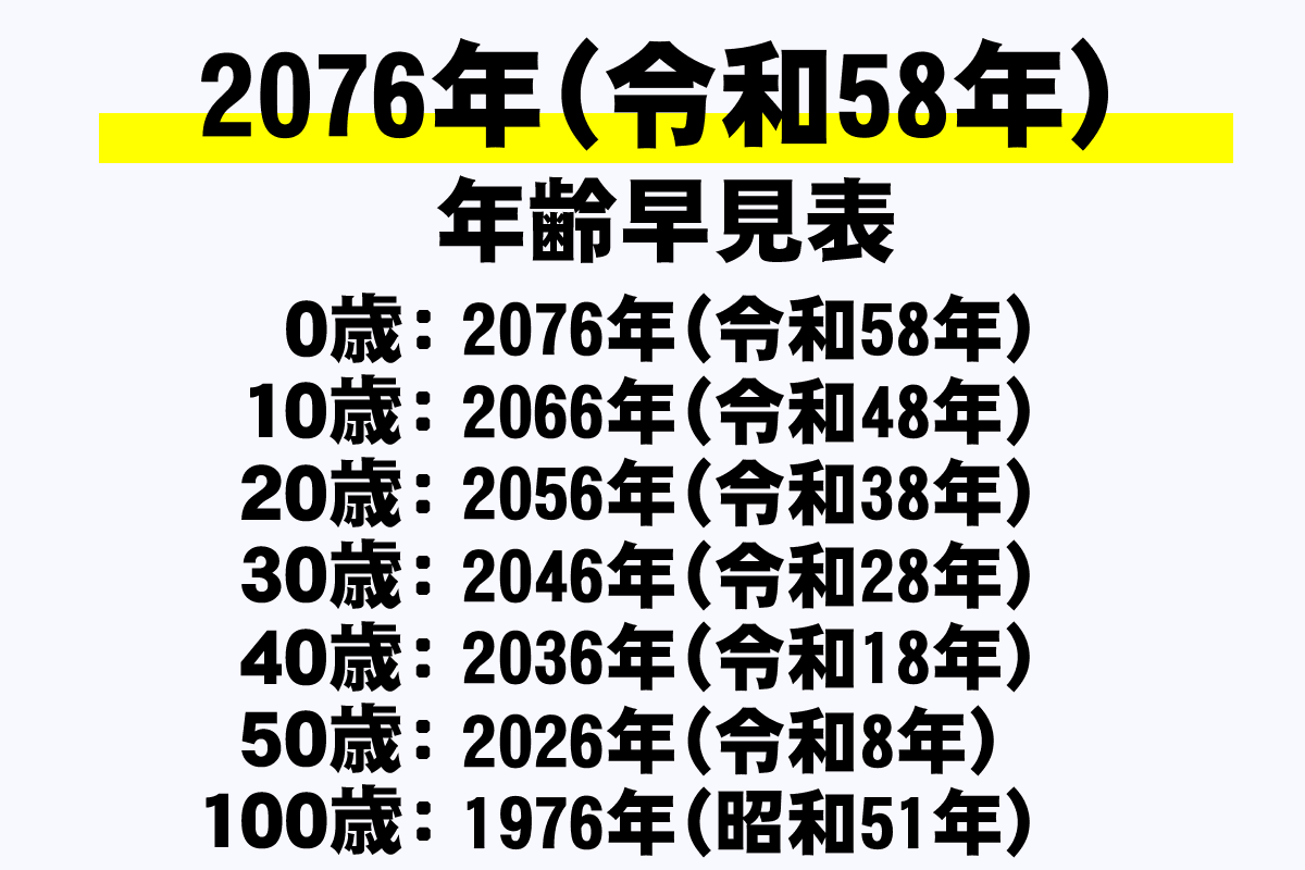 2076年(令和58年)時点での誕生年から0歳から100歳までの年齢を調べることができる年齢早見表です。